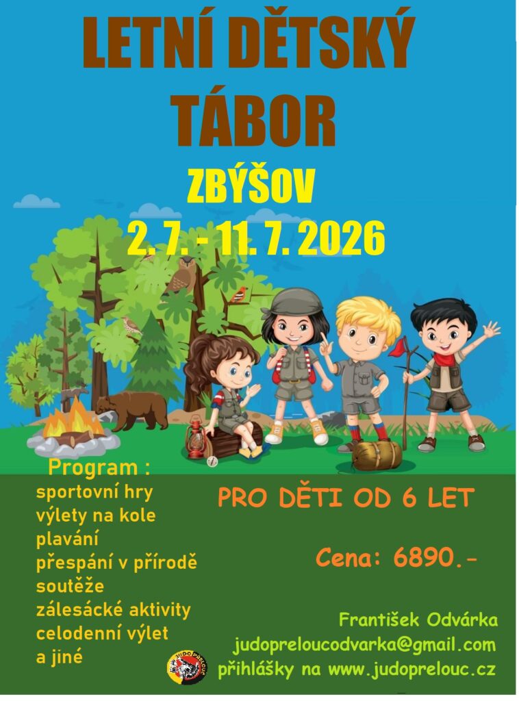 Letní sportovní tábor ve Zbýšově 2. – 11.7. 2026 Autor Martin Horský · 13.1.2026 On-line přihláška https://docs.google.com/forms/d/e/1FAIpQLSeLSlM3_kXn0-dkxnhQNmisiyEA3rKPSyymall-k_aML6y3MQ/viewform Informace na https://www.judoprelouc.cz/2026/01/12/detsky-letni-tabor-zbysov/ Share